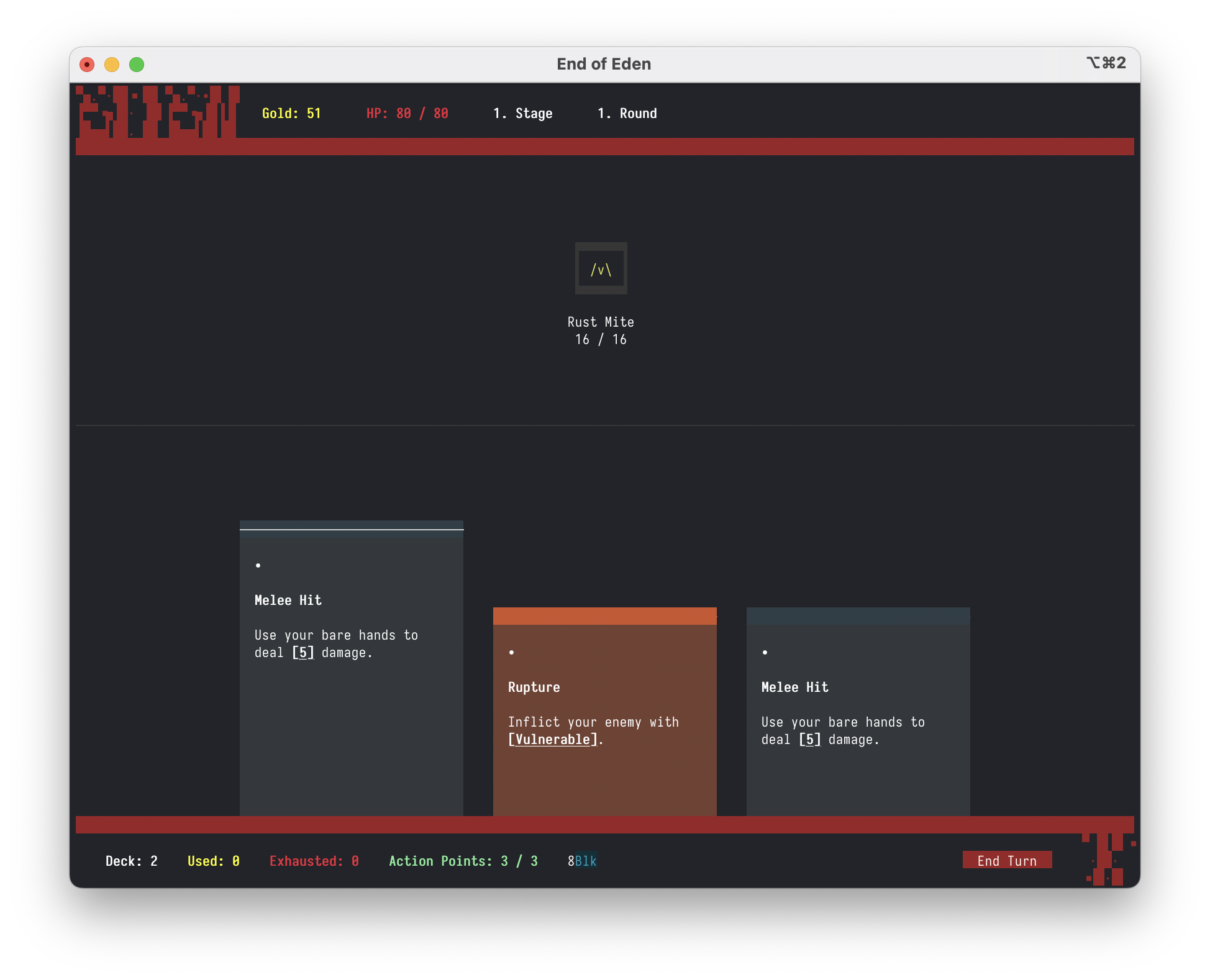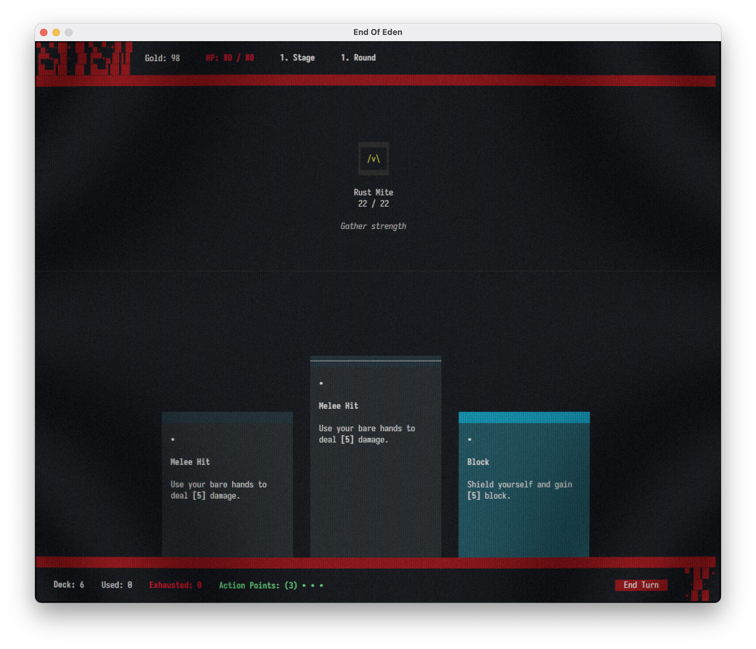 The game can be played in two ways. You can download the _term or _gl version. You can see which type you download from the file name (end_of_eden_term vs end_of_eden_gl). The _term version is the base game and runs in your terminal. The _gl version is the same game but running in a dedicated window, so no console magic is needed just a plain old game window. If you are not familiar with the terminal, you can try out the _gl version. It also comes with a optional crt shader to give the game a more retro look. Check out the Settings section for more information.