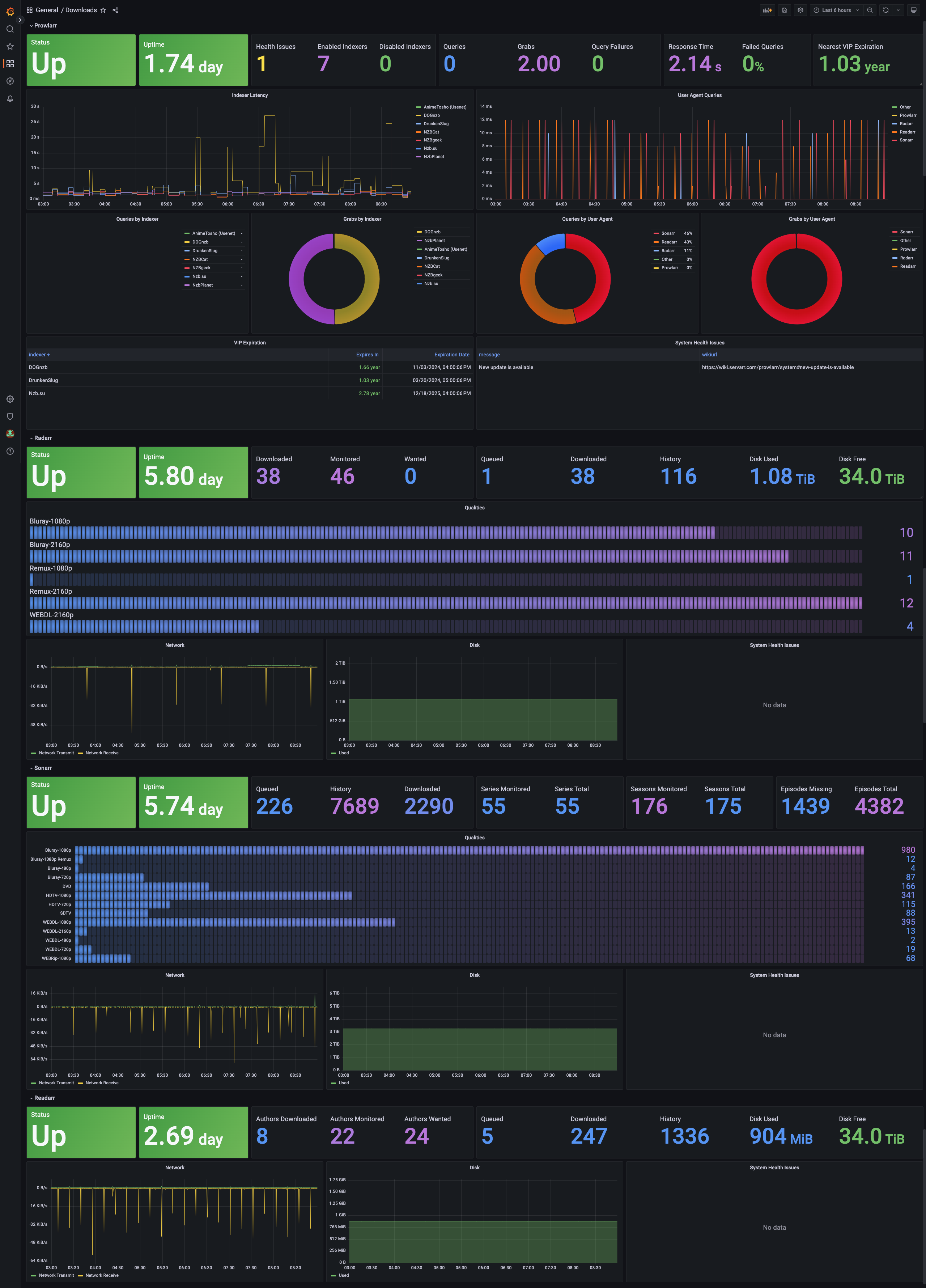 Exportarr is in maintenance mode, trying to collect metrics from these applications is not up to my standards — meaning gathering this data from the Sonarr, Radarr etc... APIs is not ideal. If these apps ever expose a stats API endpoint that can be use to collect data instead I might be willing on refactoring it to support pulling data from that instead.