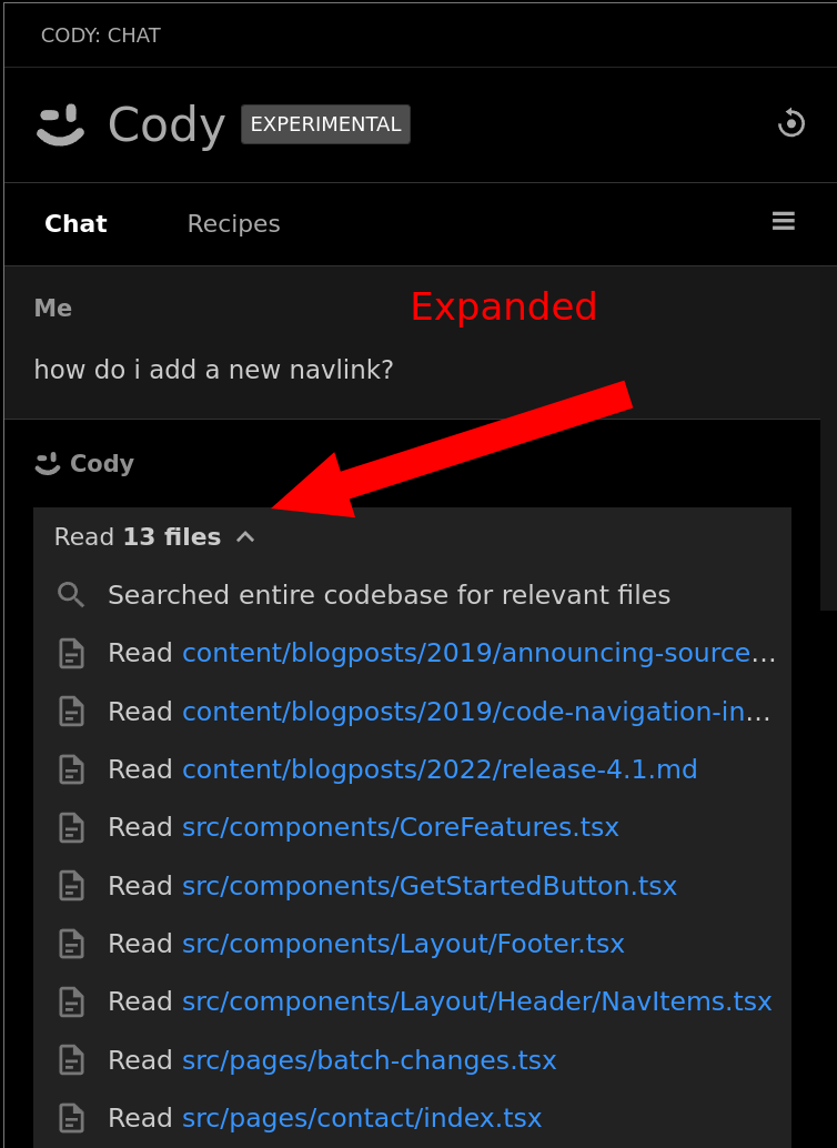 Instead of showing these in a longer message after Cody's response, the files that Cody read are now shown in a small chip before the response: `7 files read`. Expanding it shows the first step (searching) and each file. This UI can be extended to more kinds of plugins/actions in the future.   ## Test plan Open Cody. Run a query that requires it to read files. Confirm they show up here.