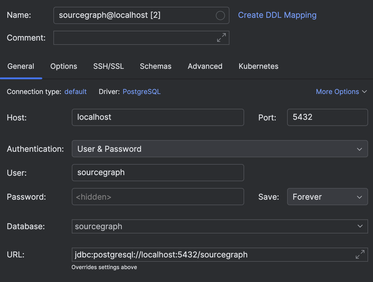 Below we'll assume the default config for postgres. It is defined in [`sg.config.yaml`](/sg.config.yaml) (or your overrides),