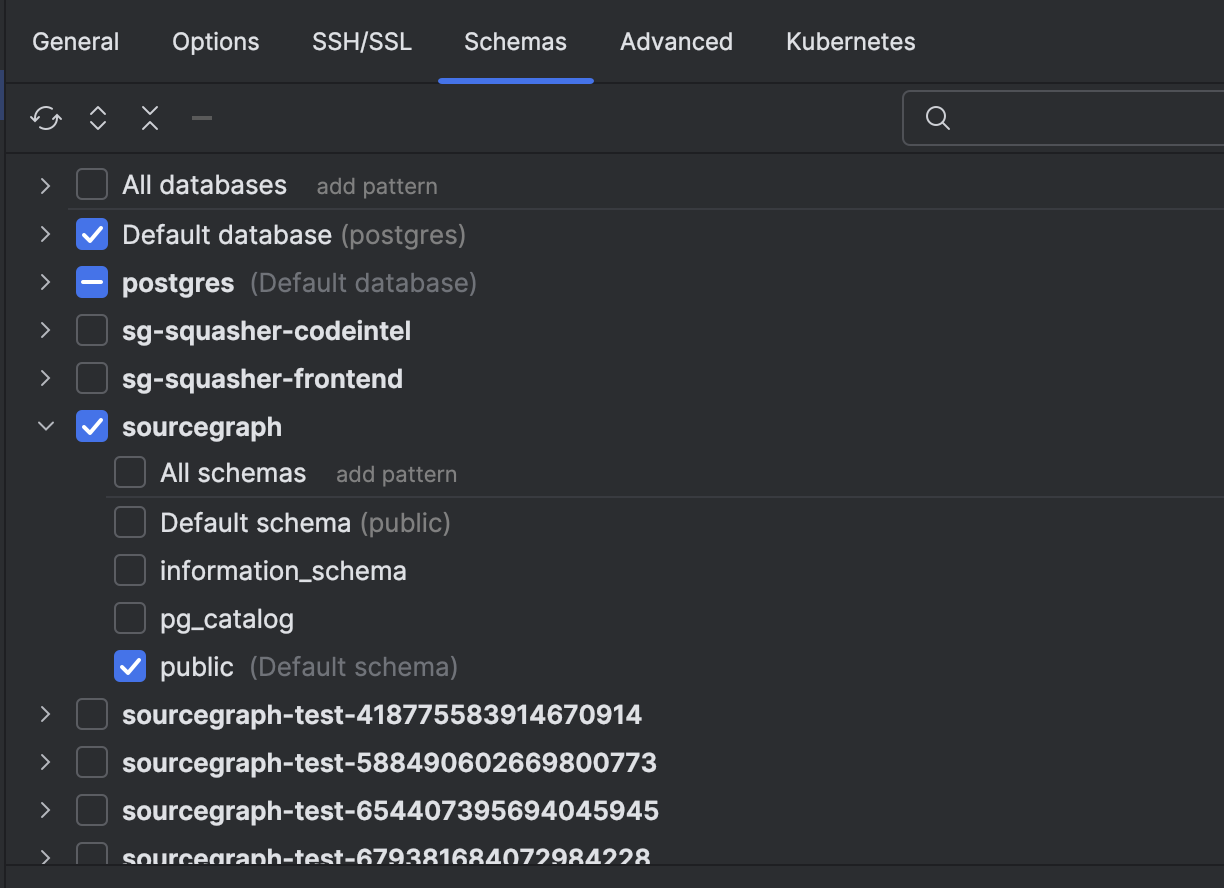 In the `Schema` tab of the connection settings, select the `sourcegraph` database, and its `public` schema. Extend